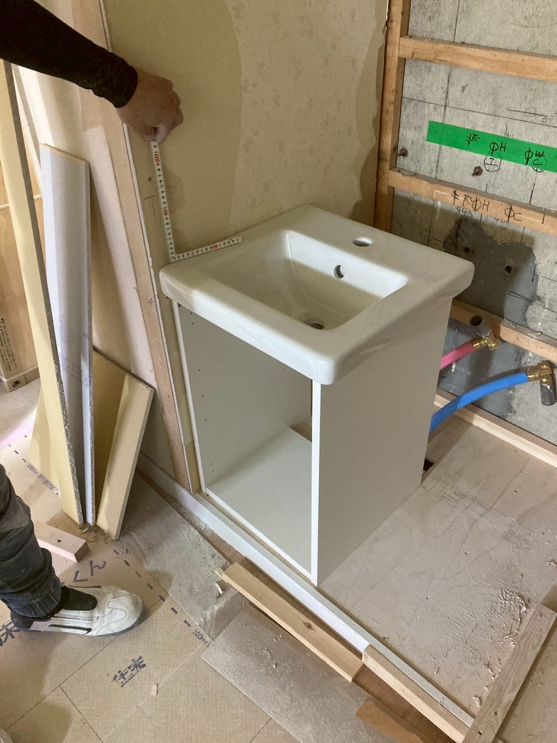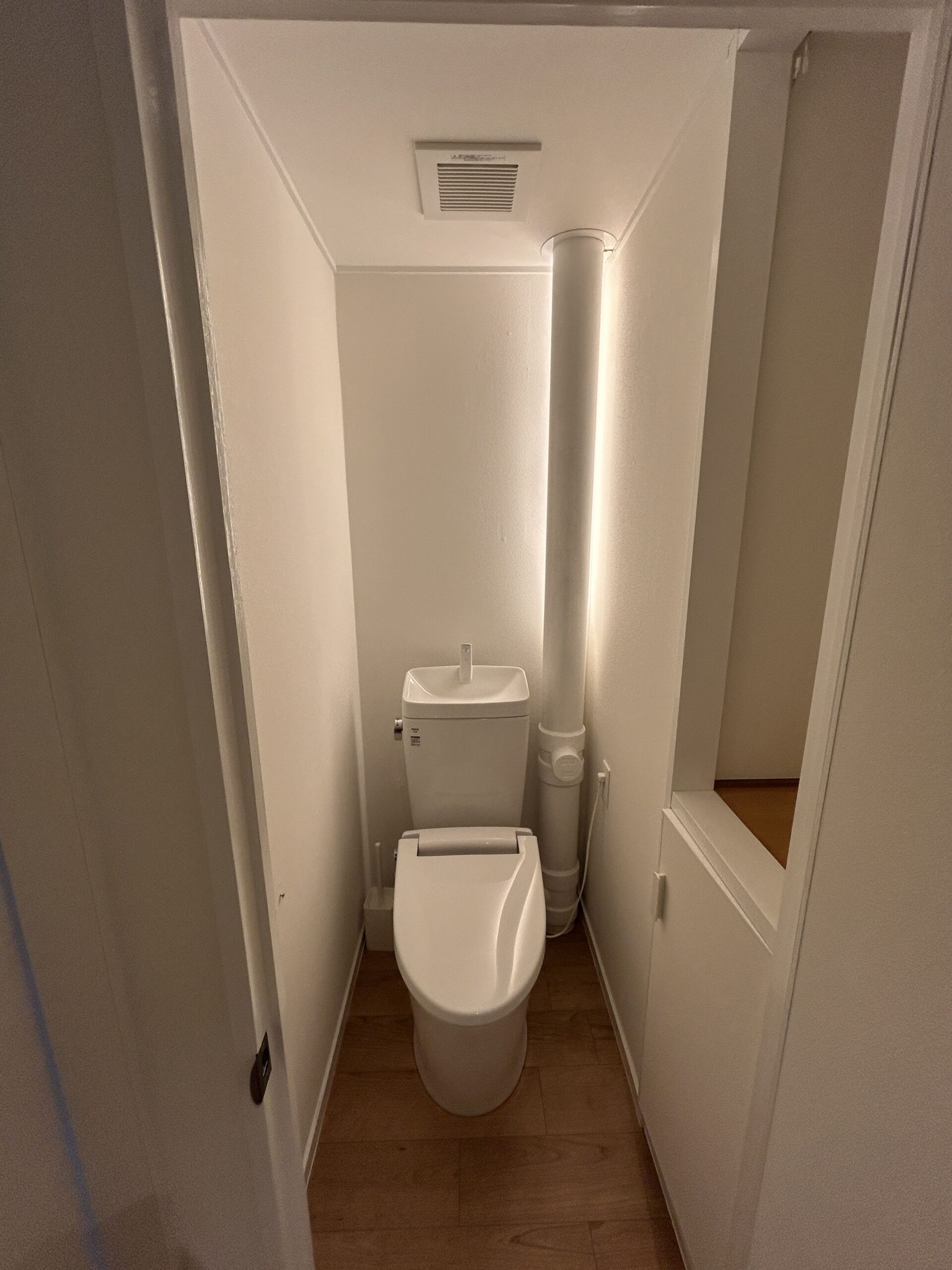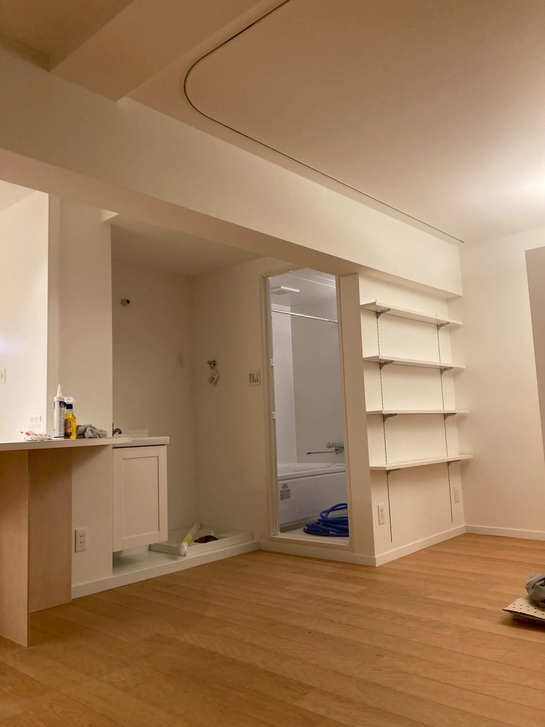 K様邸~水回り編~@東京都 2025年10月20日 最終更新日時 : 2025年10月20日 builddesign 居室編、キッチン編に続いて水回り編。 before after お客様支給の洗面台は、脚を付けず浮かせて設置し、その後ろにタオルなどを収納できる家具を製作取付。 お手洗いも新しいものに交換。こちらも間接照明をつけています。 before after