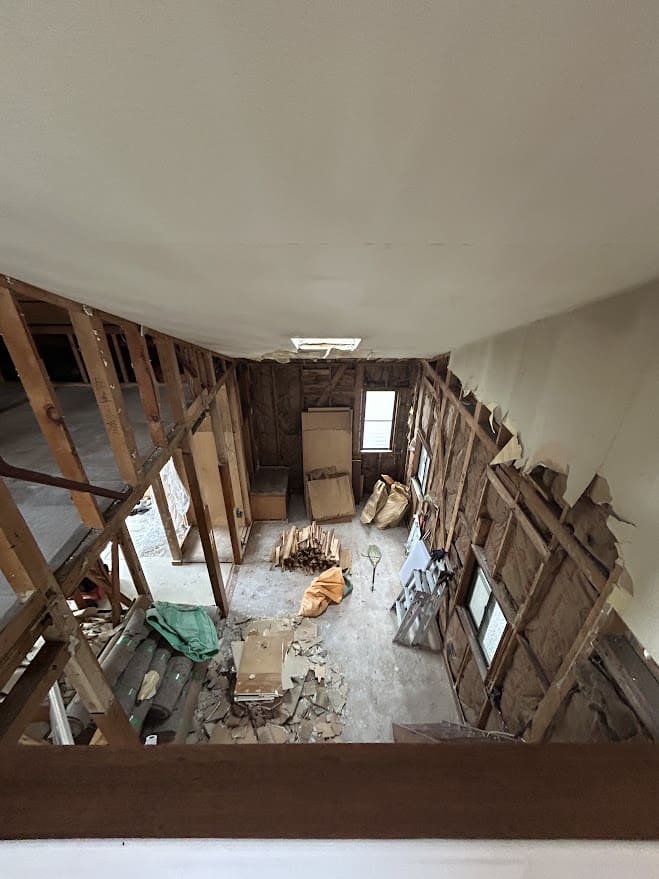 外壁は残しの為、壁下地は既存を利用しながら補強・天井新規下地・断熱材交換・サッシ交換等も実施。