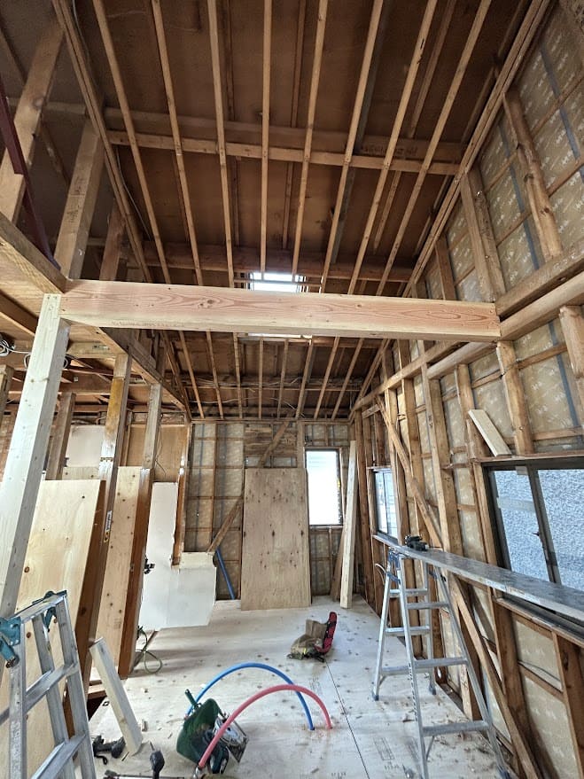 ほぼスケルトンにして、2階床下地・間仕切り変更の為、梁を太くしたり柱を抜いて梁を入れるなど構造部分の変更を行いました。