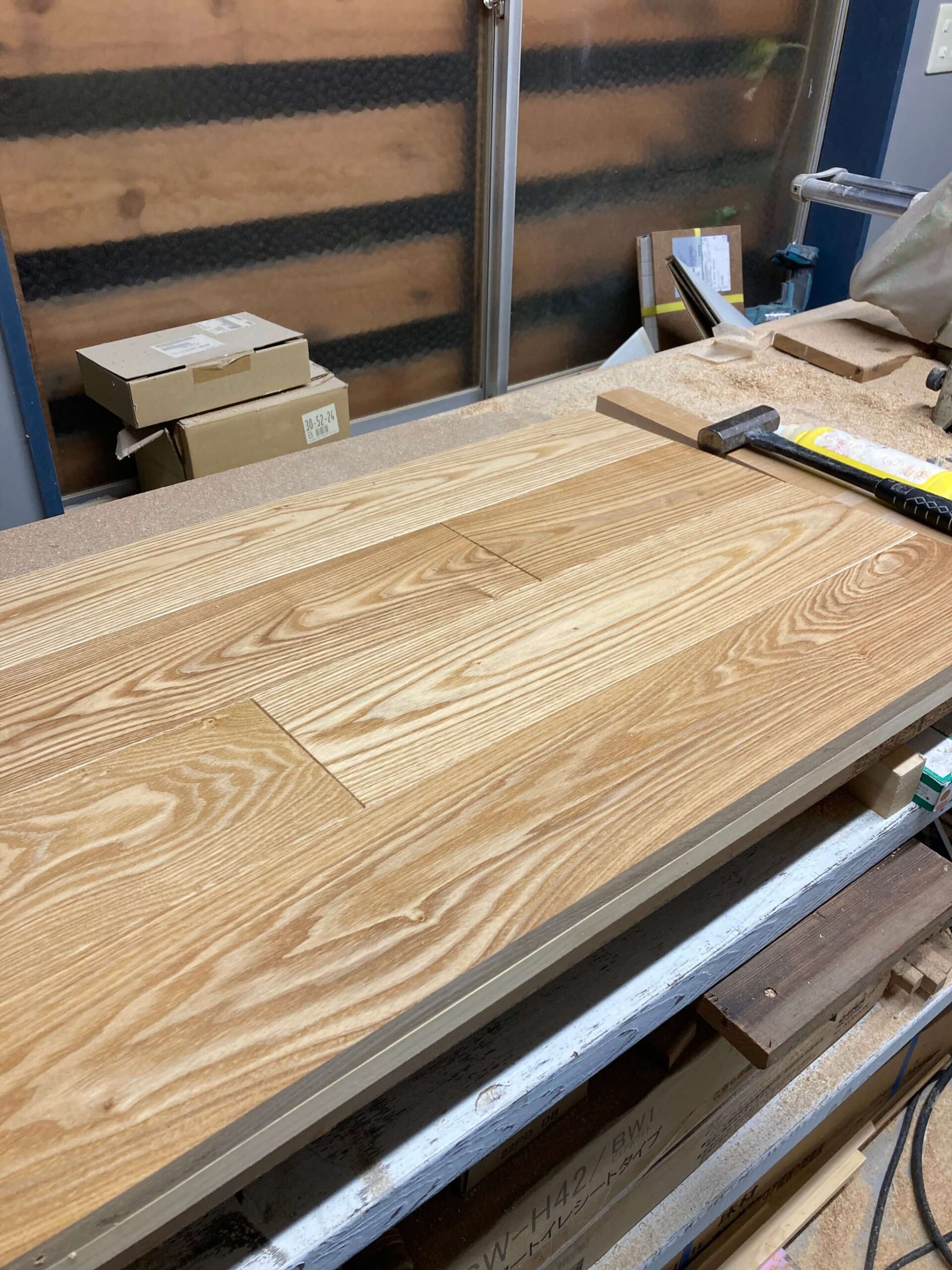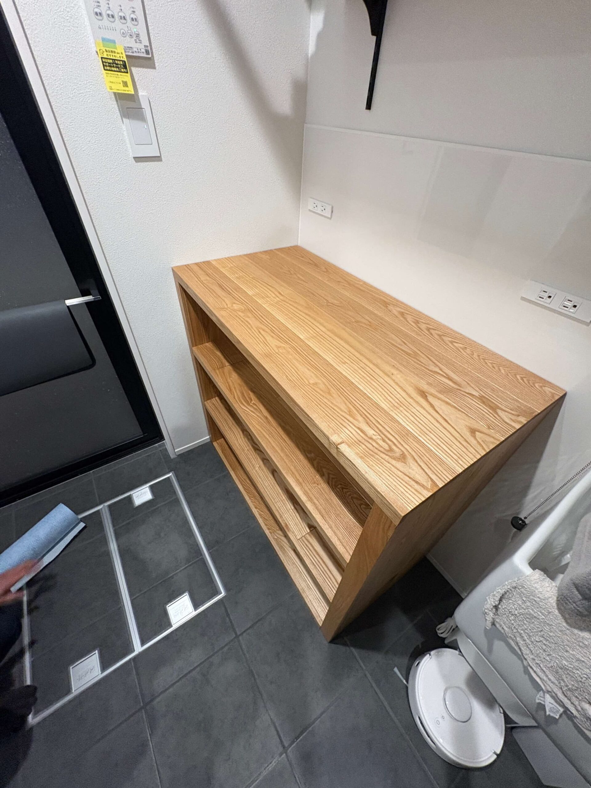 出張大工:棚作成@東京都 2026年1月14日 最終更新日時 : 2026年1月5日 builddesign お問い合わせフォームより、「新築時に余った無垢の床材で収納棚を作成してほしい」と出張大工のご依頼をいただきました。 棚のイメージ図と床材の写真をメールでお送りいただき、床材のみで組み合わせて造るには強度が不足するため、下地を造って床材を貼る形をご提案。また、同じフローリングでの縁見切りをご希望でしたので、切った小口部分をオイル塗装する内容で見積作成となりました。 工房で製作し、洗面所のスペースにぴったり沿うサイズで奥行のある棚が完成しました。 ビルドデザインの出張大工 お問い合わせ